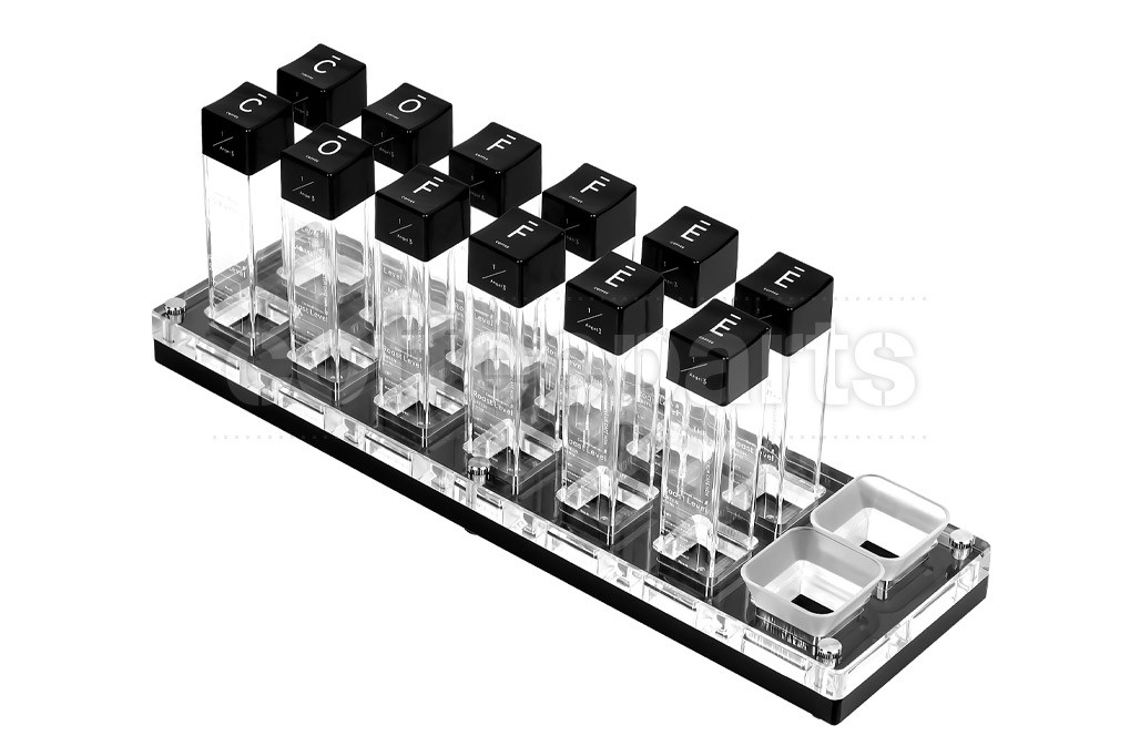 • Dimensions and weight: Each tube 30 mm x 30 mm x 123 mm. 12 tubes version base 386 mm x 110 mm. Tube capacity up to 50 ml liquid or 18 to 20 g of coffee beans, affected by roast and packing.